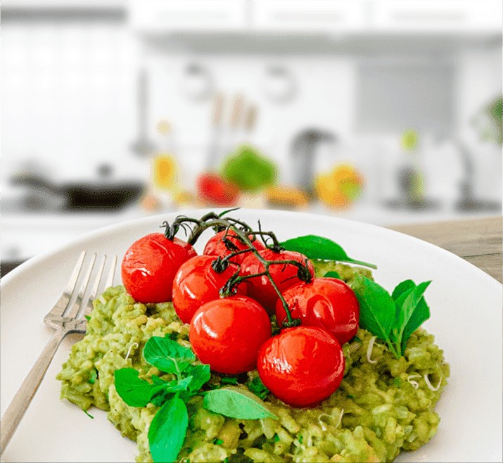Juntes o pesto e mexa bem, adicione os tomates e mexa com cuidado.